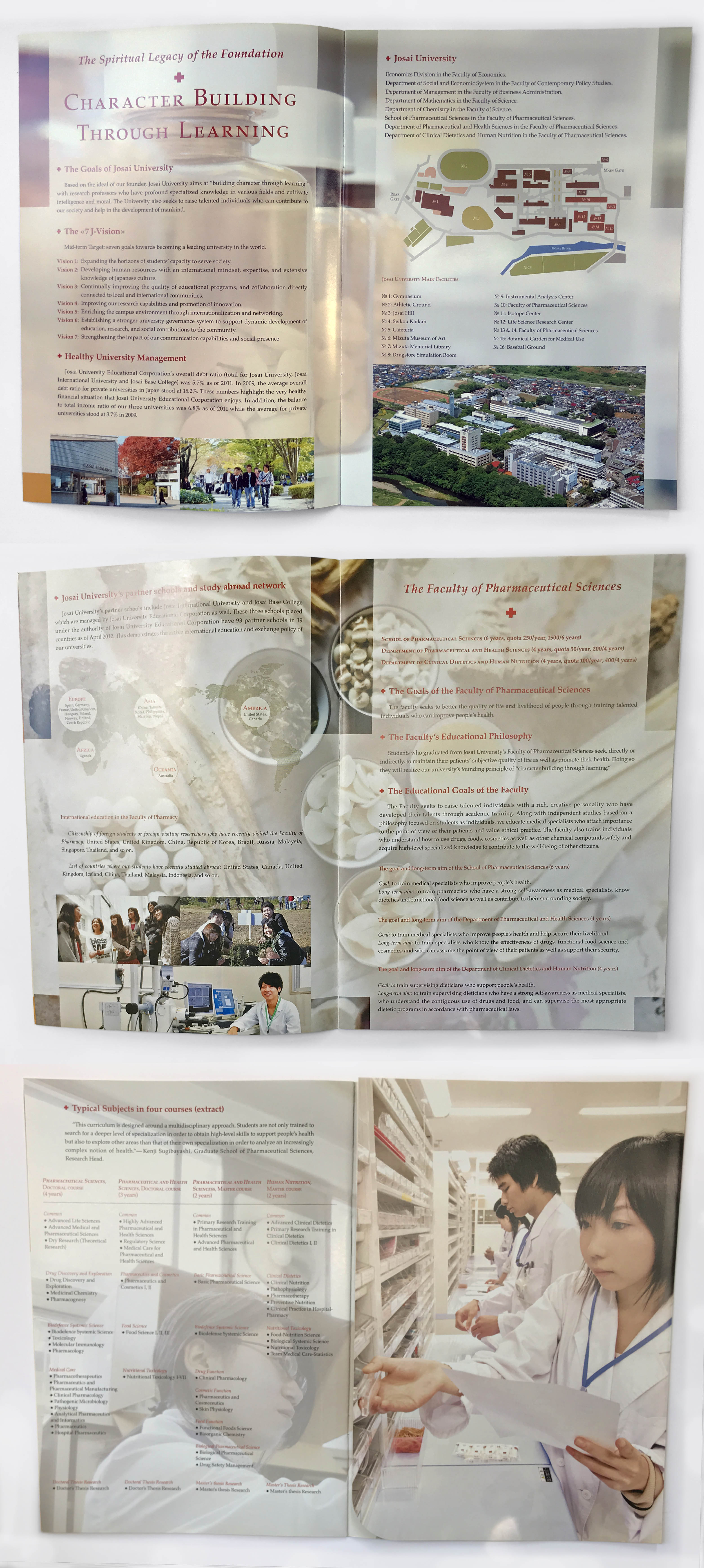 Josai University’s Faculty of Pharmaceutical Sciences seeks to attract more international students to its programs. The audience for this pamphlet are young adults in their late teens, a group usually attracted by glossy, colorful and dramatic photographic imagery as well as vibrant color palettes. To meet the demands of this audience, the brochure makes extensive use of photos; often retouched to enhance hues and saturation. The motif of the cross, an internationally recognized symbol of the pharmaceutical profession, is used consistently through the pamphlet both as an icon and as a visual device to structure page layout.