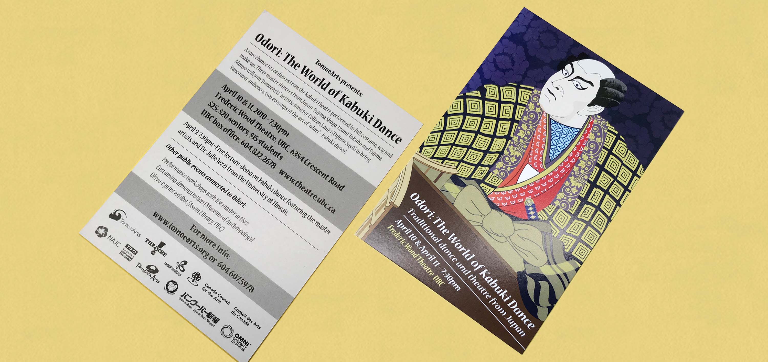 A3 Poster and postcard invitations for a Kabuki theater event. The illustration represents the master dancer invited from Japan, posing in full costume in front of his own heraldic symbol. The style of the illustration is that of Edo-period (1603–1867) wood block prints, a very popular medium for communication at the time Kabuki was at the height of its popularity among townsfolk. Among the many prints produced during the late Edo-period, the so called “actor prints,” Yakusha-e which depicted scenes and actors from the Kabuki world were widely sold. They are often characterized by enough realistic detail that scholars have been able to identify the subjects of many of these prints–often down to the plays, roles and actors portrayed.